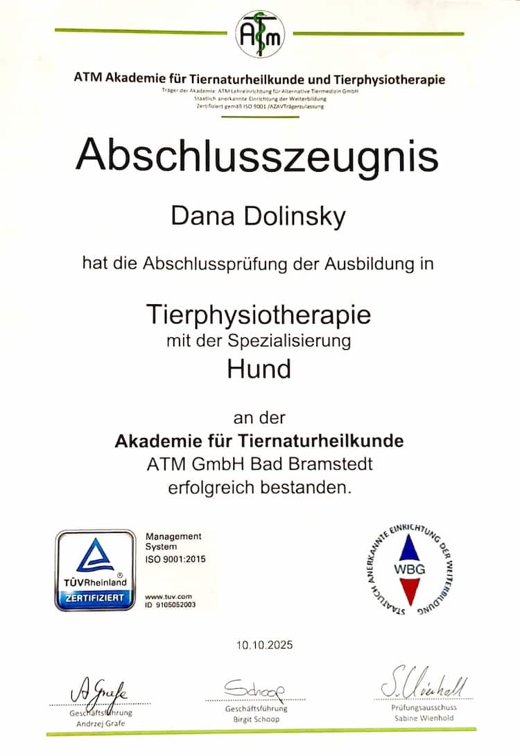 - 2024 – 2026 Ausbildung bei der ATM als Kleintierphysiotherapeutin in Bad Bramstedt